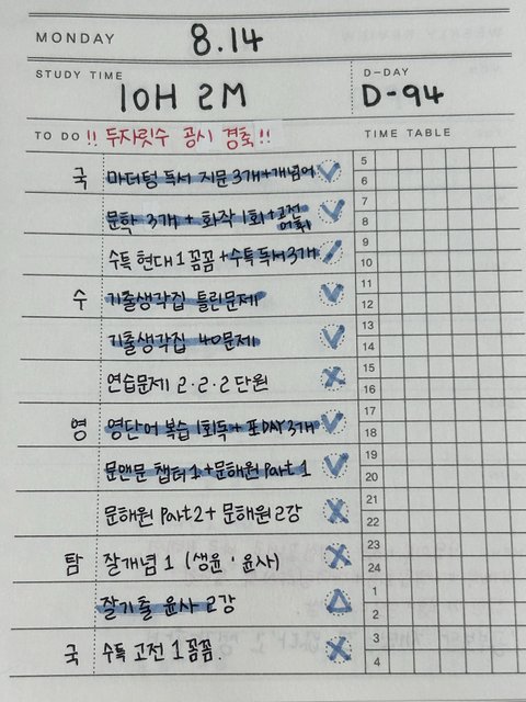 드디어… 노베재수생판녀 공부시간 두자릿수 돌파하다… 하루아침에 두자릿수 만드는 건 너무나 어려운 일이었음… 그래도 공부시간이 점점 늘어나는 게 눈에 보여서 조금은 뿌듯함 근데 플래너가 꽉꽉 채워진 느낌이 아니라서 좀 아쉬움