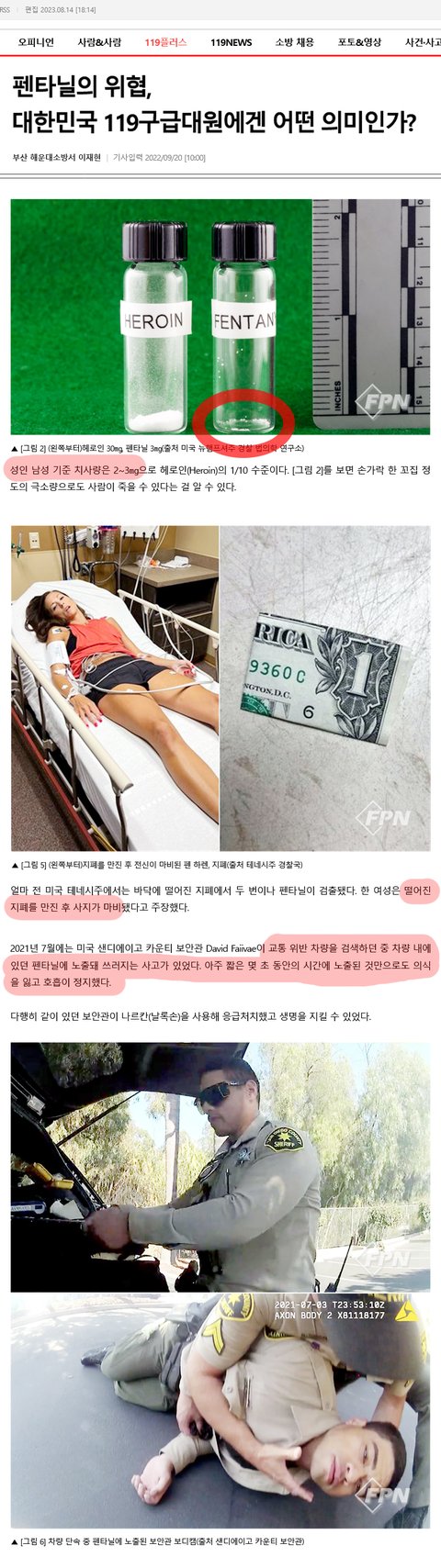 교통위반 차량단속 중 차량내 펜타닐에 노출되 호흡정지로 쓰러진 경찰)
