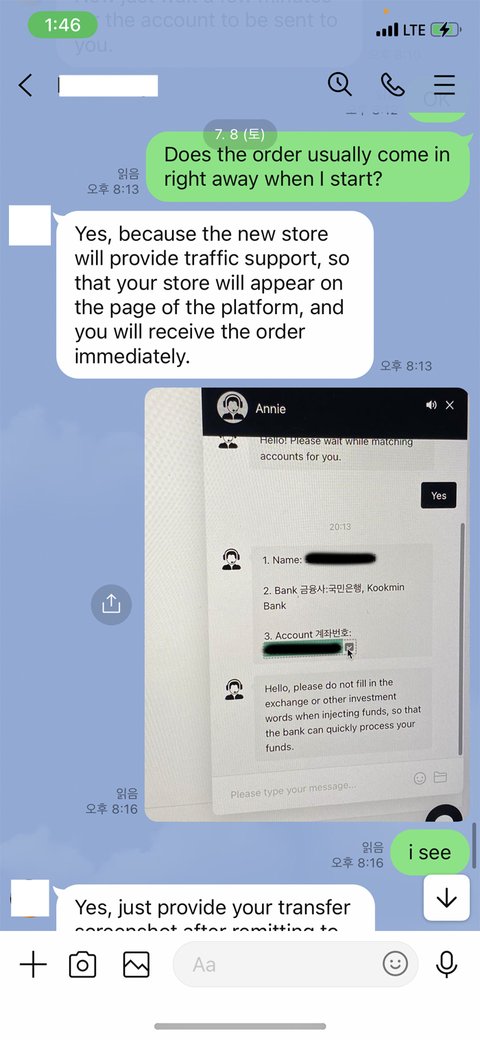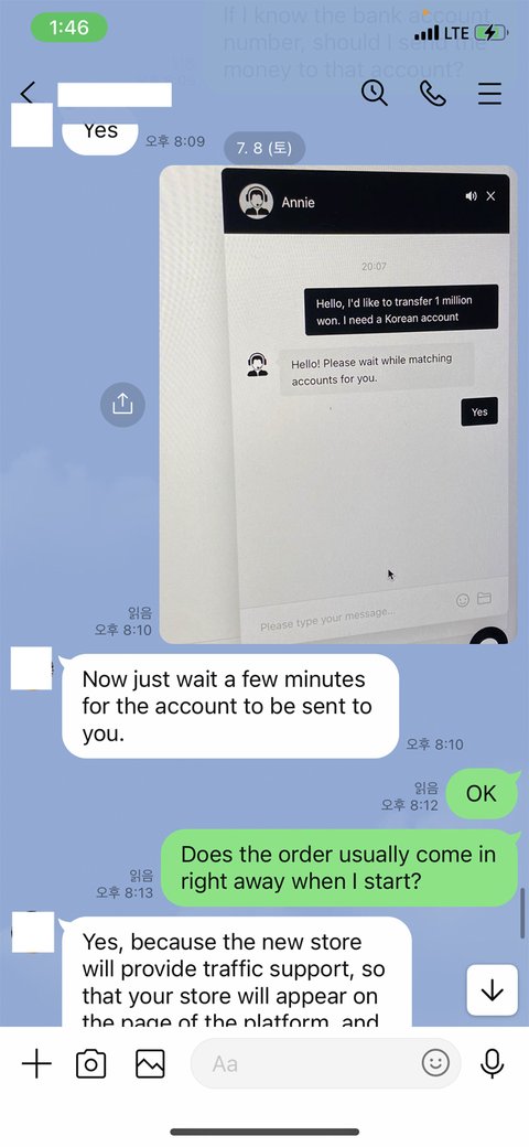 온라인 채팅 상담원에게 한국계좌를 받아서 돈을 송금하는 내용을 채팅방에서 대화한 내용입니다.