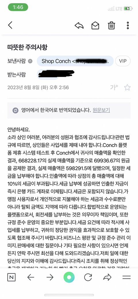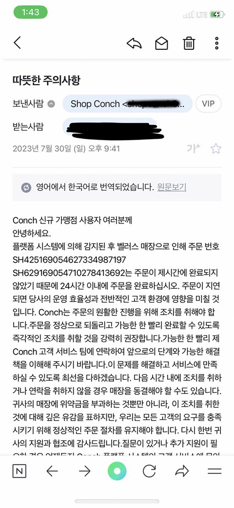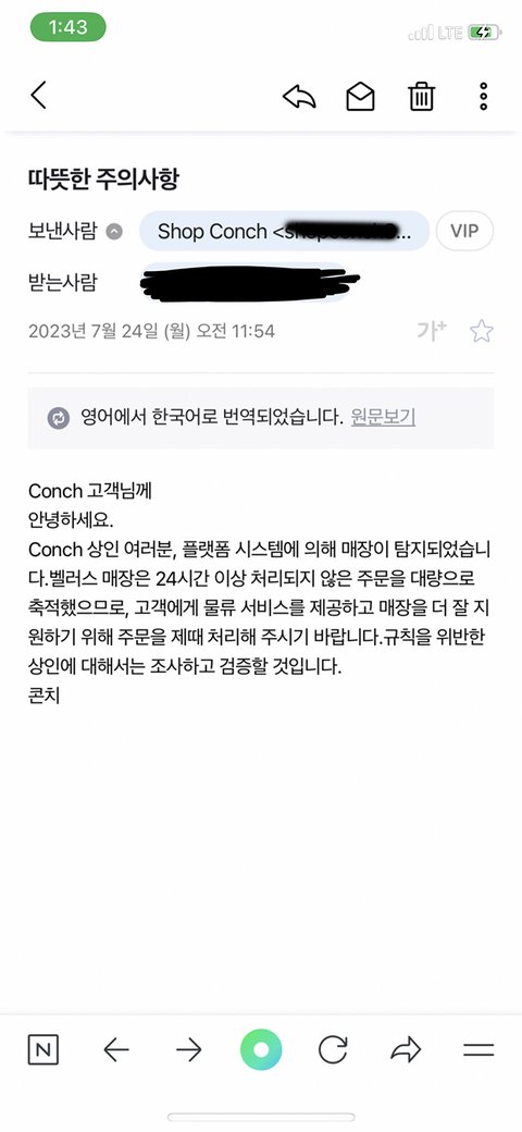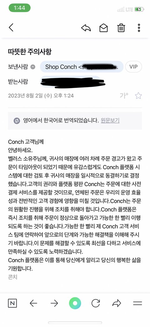 몇 번의 경고와 함께 이번에는 저의 상점을 콘치에서 동결해버렸습니다.