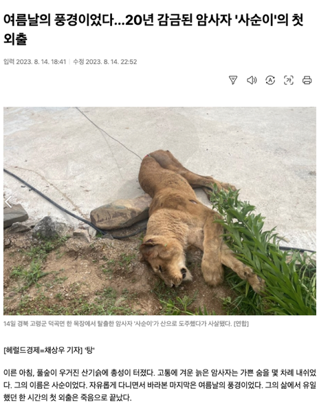 사자가 얌전했던 건 사람들에 익숙해서임 캠핑족들이 밥 주고 그랬다던데 그래서 자기 바로 코 앞에 와도 본인을 해칠거라 생각 안해서 얌전했던 거 평생을 저 좁은 우리에서 갇혀 지냈는데도 사람을 우호적으로 생각했던 사자를 넘 쉽게 죽여버리고 진짜 이 나라는 망해도 쌈 사람들 사고방식 자체가 천박하고 개이기적임 선진국이었음 여러 전문가들이 처리 방안 놓고 논의는 해봤을 거임