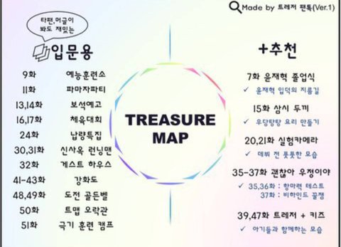 트레저의 재밌는 자컨은 트맵 남고괴담 직진남페스티벌 보면 되고 예능은 돌들의침묵 인생네컷 아빠안잔다 아이돌등판 odg최애의아이 추천하께 글고 영상들 보다보면 캐해는 어느정도 될꺼야 트메들이 추천하는 재밌는편은 대댓으로 남겨둘께