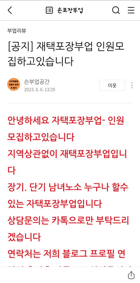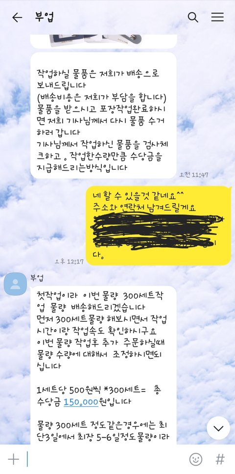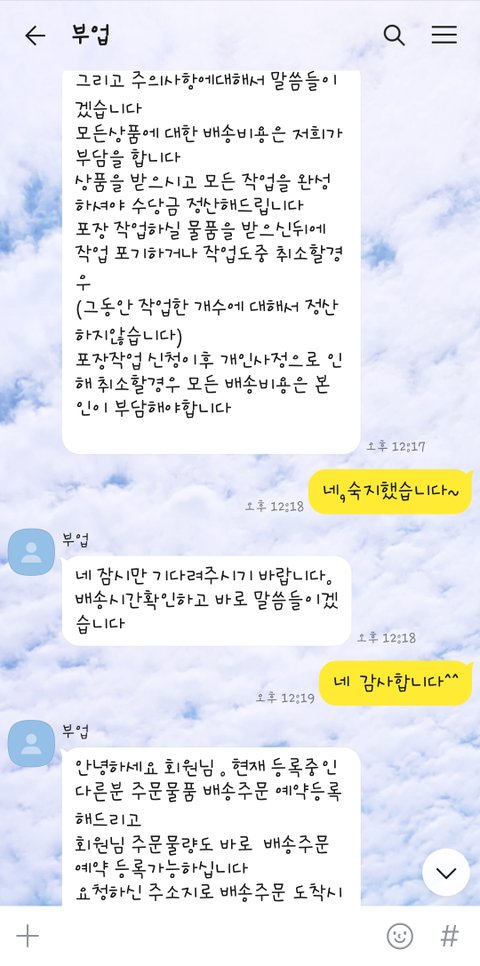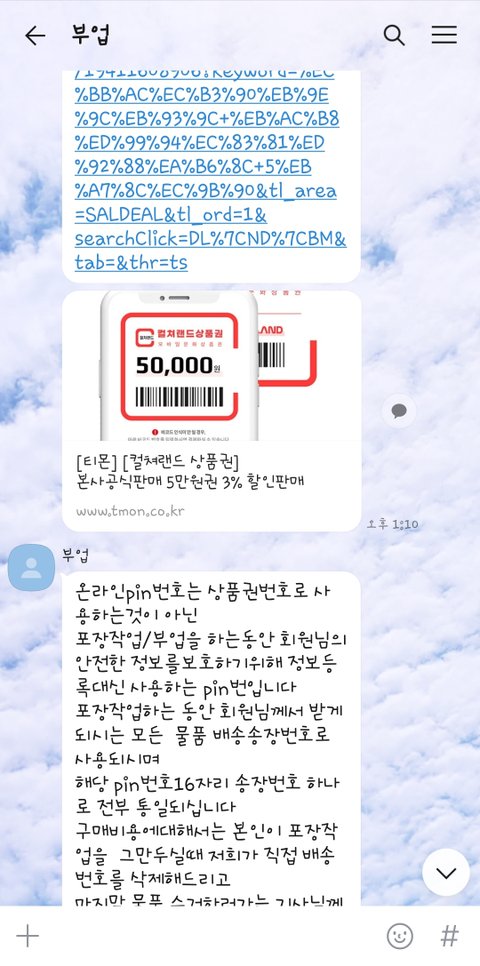 네이버 검색으로 부업을 알아보다 포장부업 인원을 모집 한다는 블로그 글 을 보고 카톡으로 연락, 일을 하기로 하고 물량이며 배송 시간 등을 안내 받았고, 송장 핀 번호가 있어야 한다며 상품권 결제를 유도 하여 바보같이 결제를 했습니다.