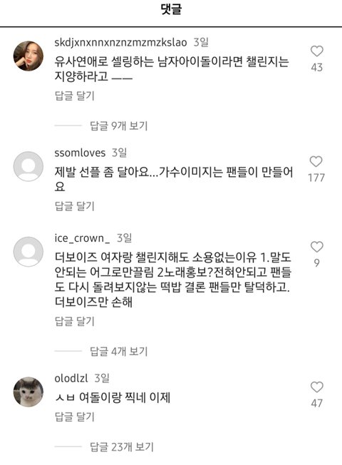 여돌이랑 찍었다고 더보이즈 현재 큐 팬들이 댓글로 악플 테러함;;;