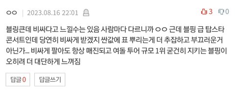근데 ㄹㅇ 팩트 아님..? ㅋㅋㅋㅋ 나 블핑 팬 아닌데 솔직히 표 비쌀수록 잘나가는 가수인거 맞고 공짜표 뿌리는 애들은 상대적으로 못나가는애들 맞잖음 그리고 공짜표 뿌려도 매진도 못시키는 경우들 있던데 솔까 팬들도 쪽팔리잖아 그럴때 ㅋㅋㅋㅋ