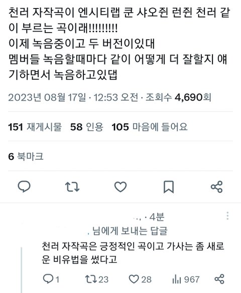 헐 이번 쿤샤런천 엔랩 천러 자작ㄱ곡!!!!!!!