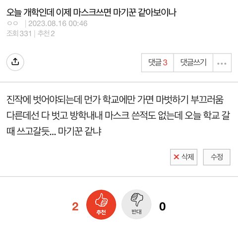 갈때 너무 더워서 벗고있다가 학교 도착할때 슬슬 눈치보면서 꼈는데 ㅈㄴ 너무 오랜만에 껴서 느낌 너무 어색했음 반 들어가니까 마스크 쓴애 한명밖에 없길래 바로 벗어버렸다... 먼가 개어색한데 편하긴 ㄹㅇ 편했음 솔직히 벗을쥴 모르고 선크림도 안바르고 개쌩얼로 갔는데 좀 밍망 내일은 쿠션 립이라도 할거 맨날 벗고다녀야지~~