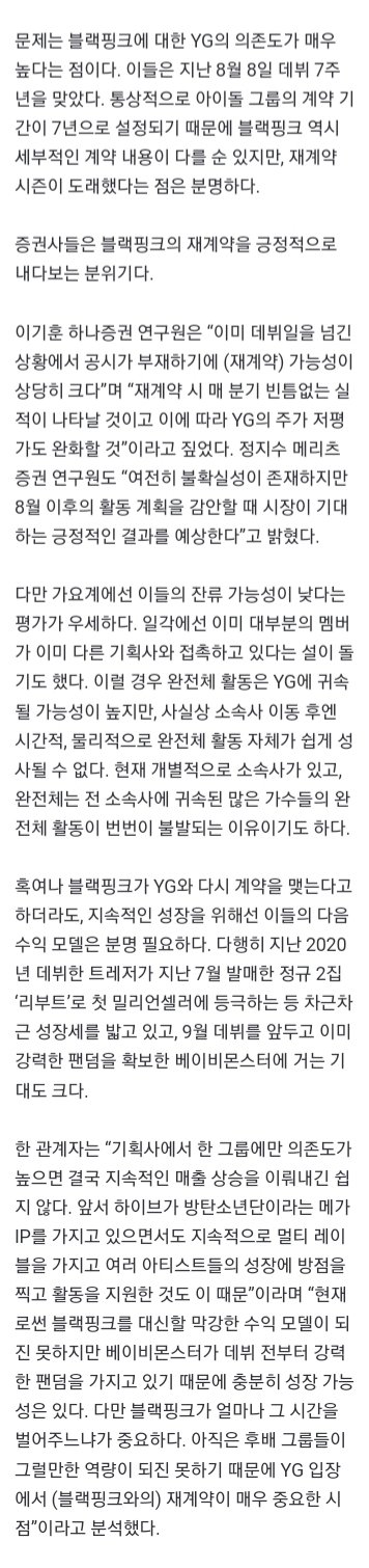 블핑 멤버들은 4명 다 워낙 ㅆㅅㅌㅊ급으로 잘나가니까 yg 그 이상의 소속사에서 더 좋은 대우 받으면서 더 멋지게 성장할 수 있는 멤버들임. 그리고 원래 블핑 그룹 자체가 평소에도 멤버들 개인 활동 활발히 하고 단체활동때는 뭉쳐서 또 시너지 내고 하던 그룹이라 멤버 개인으로는 재계약 안한다 하더라도 어차피 그동안에도 개인활동 활발하던 애들이라 갑자기 낯설게 느껴지지도 않을듯. 블핑 앞으로도 화이팅~~