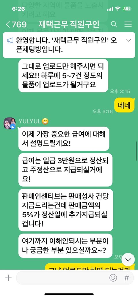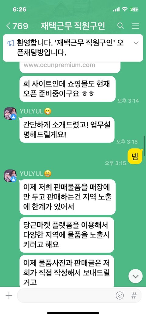 알바를 찾다가 우연히 재택알바 직원구인이라는 오픈채팅방을 알게 되었고 무슨 일을 하는지 궁금해서 그 채팅방에 들어가 물어봤어요