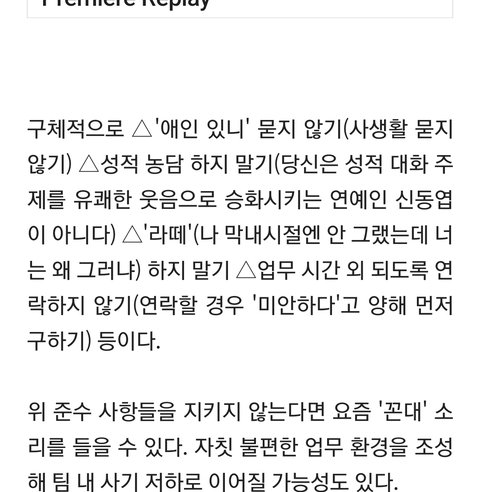 상호간 해선 안될 행동을 굳이 mz신입한테 해선 안될 행동이라 하는 이유? mz신입은 선임한테 구조상 저지1랄을 못하니까 그럼ㅋㅋ 이모뻘 선배새끼 일도못하는주제에 장난이랍시고 진짜 저러는데 지가 똑같이 당하면 뒤집어질듯? 선 안지키는거 사회생활 한다고 존1나 참는데 자식새끼 데려다 절반만큼만 똑같이 해주고싶다 ^^!!!
