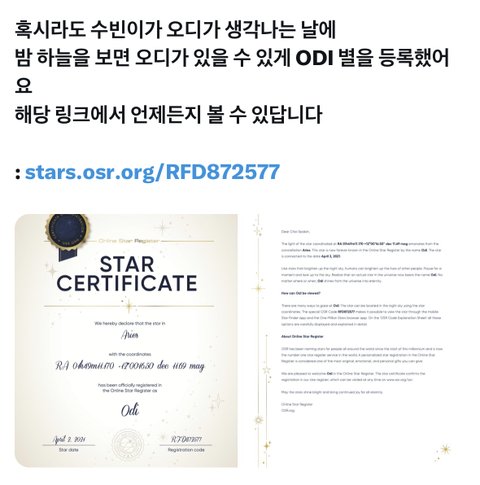 오디 별 등록하셨대… 수빈이도 꼭 이 사실 알게됐으면 좋겠다