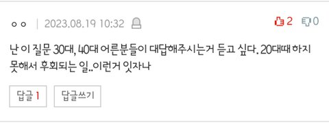 이 댓 보고 지나가는 30대가 써봅니다 - 돈 안모은거 - 당장 앞만 바라본거(전공 선택) - 사람 가려 안사귄거 - 여우짓 안한거(세상 온통 여우들 뿐.착하면 욕먹는 세상) - 학부때 학점관리안하고 자격증 많이 안딴거 - 경제 공부 안한거(세금,보험,제태크 등) - 20대중후반에 남편감 안찾은거(능력없으면 빠른 결혼이 답) *- 나보다 소중한게 있다는 착각에 빠진거(연애, 헤어지면 끝) **- 산부인과 검진 늦게 시작한거 ***- 꿈은 꿈일뿐(무의미한 희망붙잡은거)