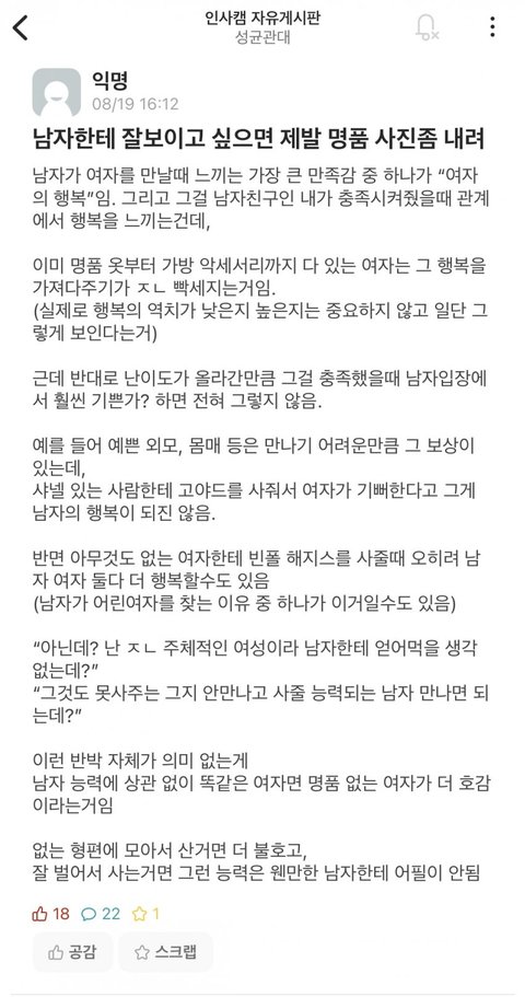 으윽 개찌질..ㅋㅋㅋㅋㅋㅋ 그니까 지가 마음에 든 여자가 명품들어서 진입벽 느껴져서 우울하단 소리지?