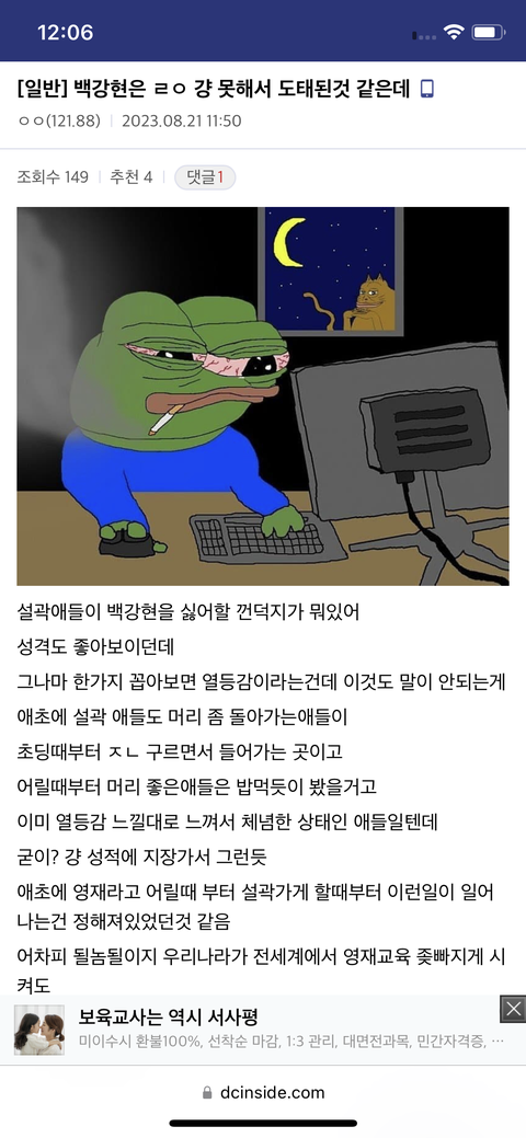 설곽에도 최상위층이 존재하지 어나더 레벨 찐 천재들걔들이 강현이를 신경쓰겠어? 잘하든 못하든 그렇구나하지. 개인주의 성향이 강해서 그다지 관심두지 않는데 어중간한 중하위층들이 저 지랄함. 못하든 말든 너하고 관계없지 않나 굳이 굳이 시간 내서 게시판에 글싸지르는거보면 대략 어떤지 사이즈 나옴. 설곽서도 찌질이 계층.
