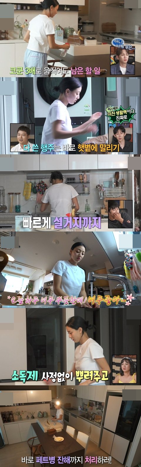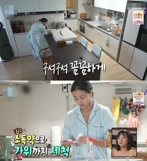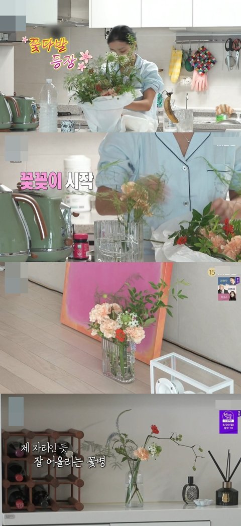선물로 받은 꽃다발로 꽃꽂이 장식하고 부엌 청소
