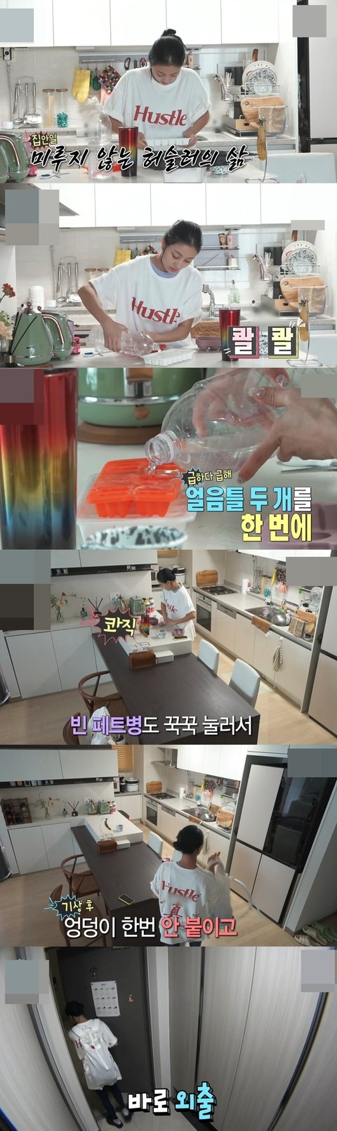 텀블러에 커피 타면서 동시에 냉장고 얼음 정리와 재활용품 정리
