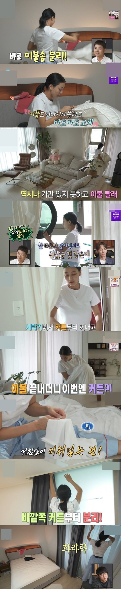 샤워하자마자 바로 이불 빨래와 아침에 빤 커튼 다시 걸기