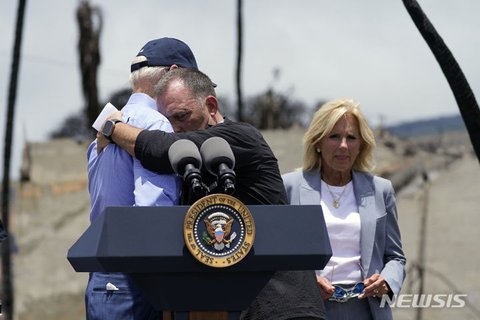 [펀글] 바이든 대통령 껴안는 조시 그린 하와이 주지사 - 뉴시스 (2023. 08. 22)