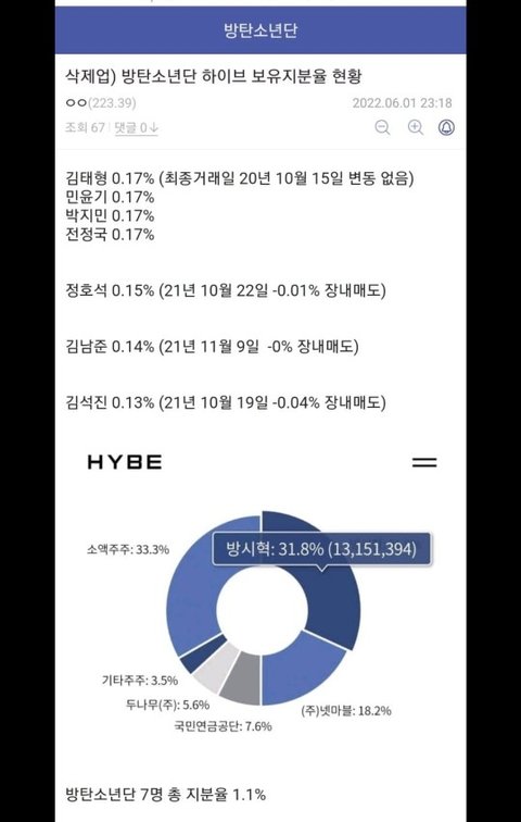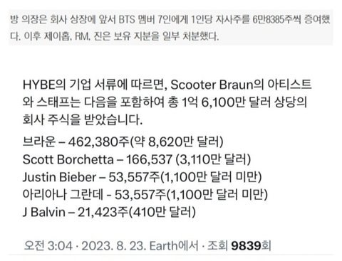 팬들은 방탄때문에 하이브가 대박난거다 생각하는데 방탄 7명에겐 모두 합쳐 1%쯤 되는 주식 줘놓고 스쿠터랑 그 소속 미국 가수들에겐 주식 어마어마하게 줬나보네 진심 정떨어지는 회사