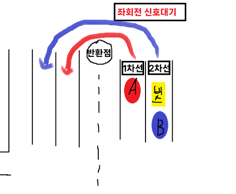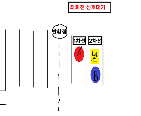 A는 1차선에서 대기중, 나는 2차선 버스뒤에서 대기중이었음.