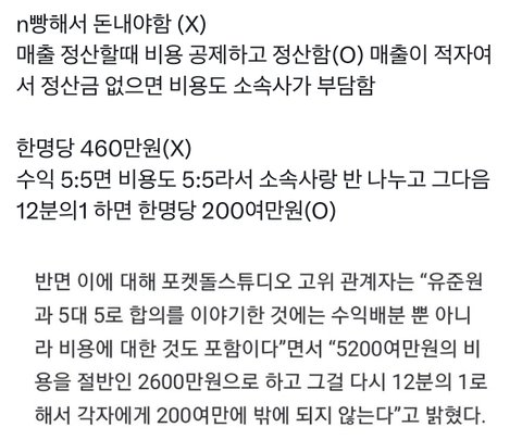 비용 매달 500만 원도 아니고 적자면 비용도 전액 소속사가 부담임 기사도 똑바로 안 읽고 물타기 뭐지 진짜