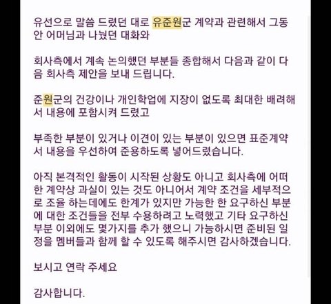 또한 중요한 것은 유준원 군은 미성년자가 아님에도 불구하고, 유준원 군의 어머니는 미성년자일 시, 해당하는 계약 조항들마저 수정을 요청하였고 이에 모두 수용을 했음에도 이러한 허위사실을 주장하는 부분에 있어 유감을 표합니다.