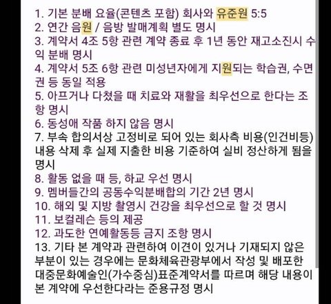 유준원 군이 공개한 부속합의서 상의 고정 비용은 연예활동에 있어서 반드시 필요한 비용만을 미리 구체적으로 적시하여 추후 정산과 관련한 불필요한 오해가 없도록 작성된 것이며 일반적인 매니지먼트 전속계약에서 모두 규정하고 있는 것입니다.