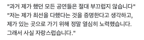 성한빈이 했던 인터뷰임 마인드도 건강하고 솔직히 나는 과거 영상들 보면 볼수록 그만큼 진심이었고 열심히 살아왔구나 싶어서 더 더 호감이었음 노력하는 자세는 절대 부끄러운 게 아님 그걸 조롱하는 사람들이야말로 더 부끄러워해야지 성한빈은 보면 볼수록 사람으로서도 배울 점이 많은 것 같아서 진짜 대단하다고 느껴