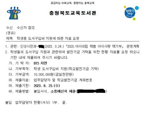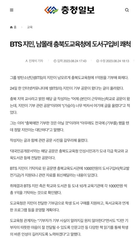 3월에 기부한건데 오늘 학교에 공문 올라와서 알려졌나봐 충청도 10군데 교육기관에 각 천만원씩 기부해서 1억! 이번 기부까지 지민이 개인기부만 8억이 넘는거 같은데 매년 좋은일하는거 너무 보기 좋다아 ᰔᩚ