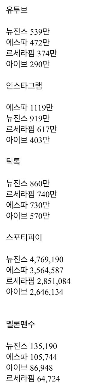 4세대 여돌 소셜지표 팩트 뉴진스 에스파 르세라핌 아이브