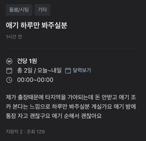 무상으로 애기 봐주기.. 나라면 무서워서라도 애기 못보낼거 같음 무상인데도 지원자가 있는것도 좀 놀랍다