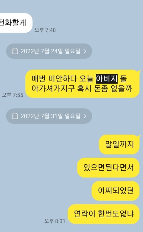 당시 아버지가 돌아가셔 돈이 필요했을때 연락을 했었는데 연락도 안받고 자기 가족들끼리 놀러다니고 있었습니다