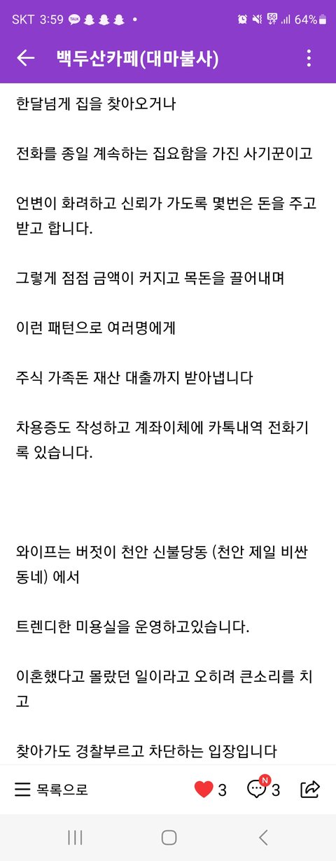 가해자는 1986년생으로 천안에서 건달 생활을하다가 징역생활을하였고 정신 차린든 행새하며 딸두명에 사진 와이프 그리고 사진을 와이프 인스타에서 계속 올리고 있었고 21년도 쯤부터 이번년도나 다음년도에 입주 예정인 천안IC근처 모아파트 펜트하우스당첨된 얘기와 같이 화물차 여러대가 있다는 얘기를 하며 집요하게 돈을 요구하였습니다