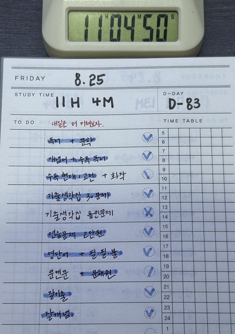 앞으론 공부 외 딴짓하는 시간도 제대로 체크해서 경각심을 좀 가져야 할 것 같음 오늘만 해도 점심 저녁때 집가서 밥먹고 늘어져 날린 시간이 꽤 적진 않음 그 시간들만 더 아껴도 더 많은 시간을 확보할 수 있지 않을까 싶음