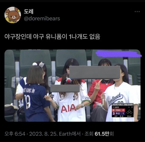 야구장인데 다들 축구유니폼 입고 옴ㅋㅋㅋ 그 와중에 맨 오른쪽 ‘엑소플래닛’