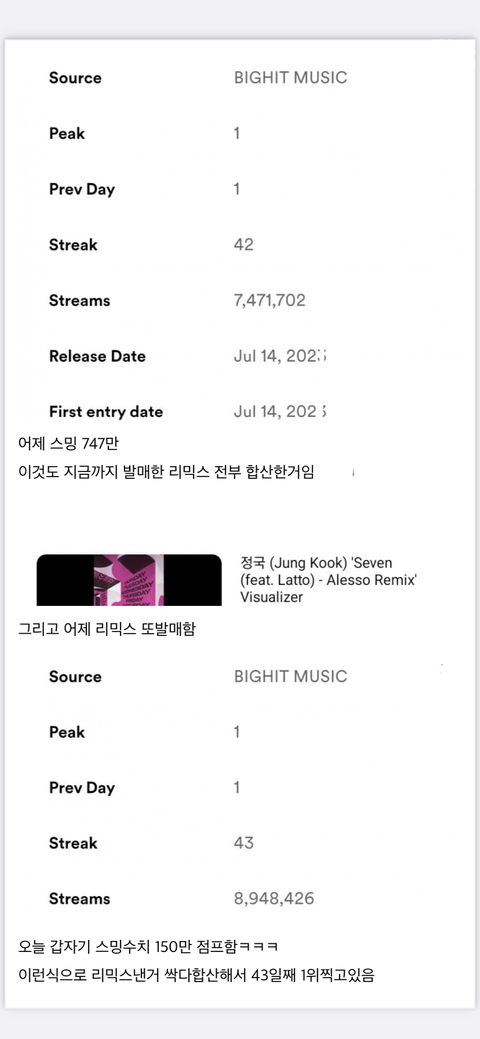 스포티파이는 리믹스 합산 아닌데 리믹스는 빌보드땜에 내는 거임 스포티는 따로 잡혀