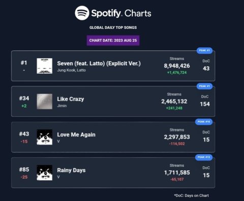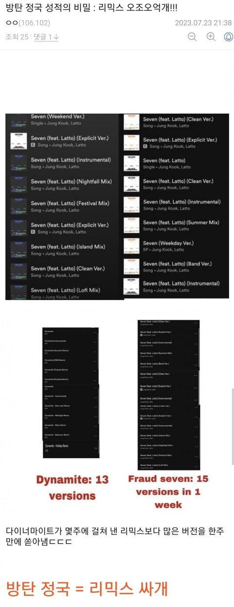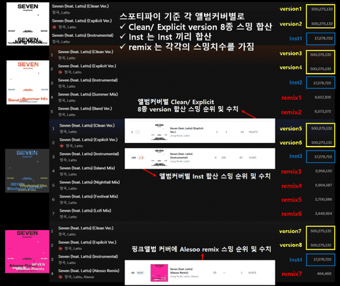 정국 리믹스 8종 스포티파이 하루 맥스 스밍량 20번 * 8= 160 스밍 한곡에 전부합산됨 지민 리믹스 2종 스포티파이 하루 맥스 스밍량 20번 * 2= 40 스밍 한곡에 전부합산됨 뷔 1종 스포티파이 하루 맥스 스밍량 20 * 1 =20 스밍 합산될 리믹스가 없음 차이봐라 당연히 날수밖에 리믹스 많이 내면 낼수록 스밍량은 배로 올라간다 전부 합산되니까 사기꾼들 눈속임 언제까지 할거야