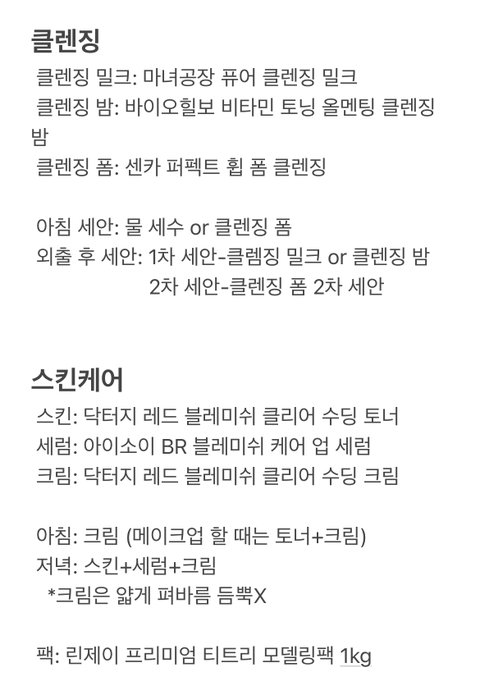 내가 지금 정착한 기초들이야! 나는 이중에서도 토너랑 세럼 추천해 근데 물론 사람마다 다를 수도 있어...! 클렌징폼 같은 경우 예민한 사람한테는 안 맞을 수 있다니까 다른 거 쓰길 바랄게!