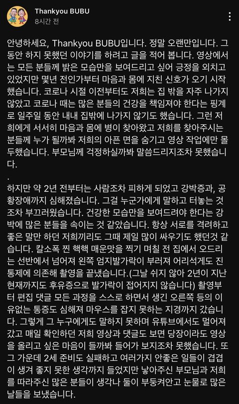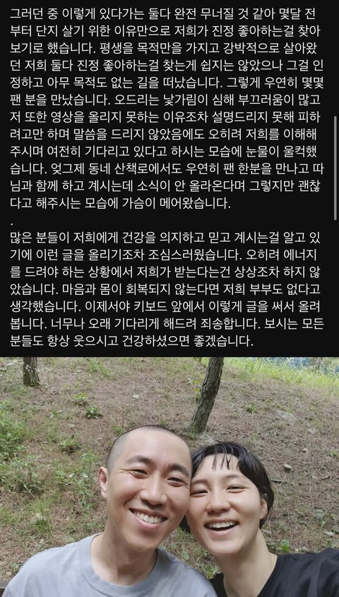 땅끄부부처럼 일반인들한테 운동에 쉽게 접근할 수 있게 해 준 사람들 ㄹㅇ 얼마 없을 듯... 땅끄부부 덕에 건강해진 사람들 진짜 많은데 본인들은 힘드셨다니 맘이 안 좋다 ㅜㅜ 지금 올려둔 영상으로도 충분하니까 더 이상 부담 갖지 마시고 그냥 가끔 근황이라도 올려 주셨으면 함... 행복하시길