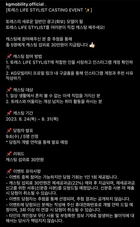 KG 모빌리티 토레스에서 일반인 모델인 ‘토레스 LIFE STYLIST’ 선발 중인데