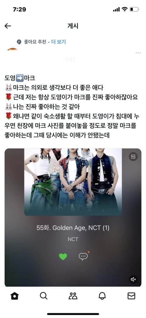 ㅋㅋㅋㅋ아 웃겨 약간 과장된건데 더 정확히는 도영이 슈퍼휴먼 앨범을 갠적으로 샀는데 그 앨범에서 마크 포스터가 나와서 천장쪽 벽에 붙였다고 함 (근데 다른 멤버도 나왓는데 마크만 붙였다고함ㅋㅋㅋ) 마크가 아들이였으면 좋겠다고 하는 도영..