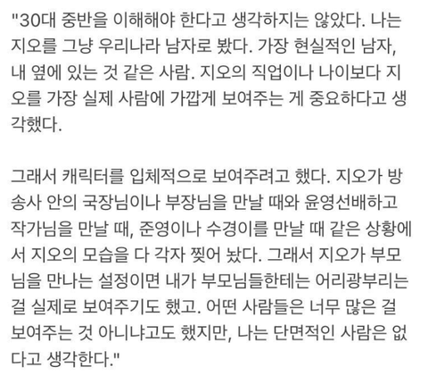 "무서운 연기를 하는 친구다. 노희경 작가의 주관적인 대사를 객관적으로 읽어나갈 때도 있고, 객관적인 대사를 주관적으로 읽어나갈 때도 있고. 능수능란하다."