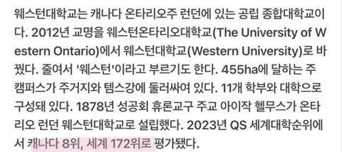 웨스턴대는 캐나다 8위 세계 172위인 대학