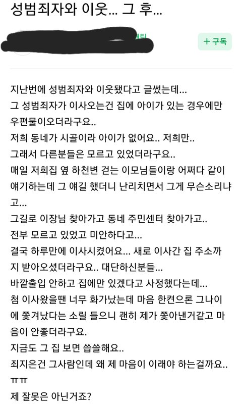 계속 저런 식으로 쫓겨나고 해야, 미국처럼 성범죄자 전용 마을이 생김. 거기에 세금 더 들어가는 건 열 받지만.. 또다른 피해자가 생기는 거 생각하면, 하나도 안 아까움. 미국처럼 사람 없는 땅 찾아서, 거기서만 살게 해야 함.