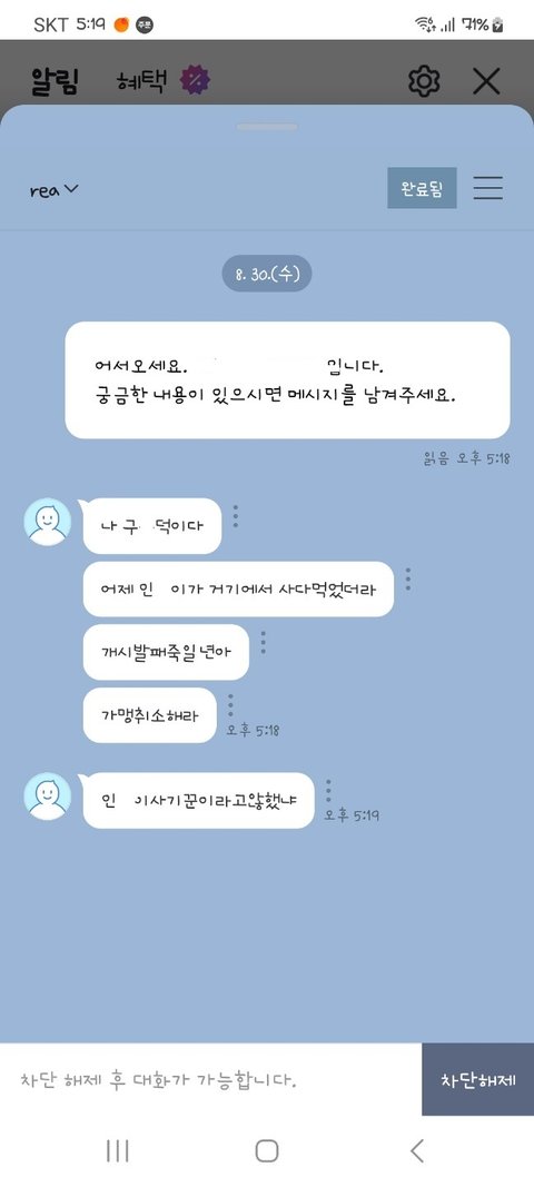 요즘은 워낙 세상이 흉흉하고 무섭다보니 누구를 죽이겠다 살인예고글만 올라오면 어떻해든 IP추적을해서 당일날바로 검거를 하는 세상이잖아요?! 그런데, 접수후 3개월이 지났는데도, 단서조차도 범인의윤곽조차도 ...... 알수없는 상황입니다. 저는 하루하루가 고통스럽고 지옥인데말이죠. 더욱이 이제는 대놓고 자기 전회사 대표 구@@ 이다 카카오톡메신저도 제가 차단한것만 30개는 족히될거같고 전화번호도 제가아는것만 최소 20개이상은되는듯 하더라구요. 거의 제가생각할때도 전 회사에 대표가 제가 중도하차하고, 사실 아버지일 손거들어드린다고 최대한 기분않상하도록 좋게좋게 이야기해서 8개동안 같이 업무보고 퇴사를 한건데