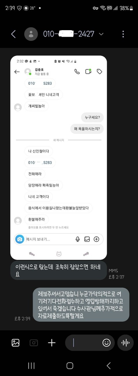 그리고 더더욱 소름돋는건 제가 어제 어디서 어떤걸 주문해서 먹었는지까지..... 전대표라고하면서 그 업주님에게 인스타그램디엠을 보내서 제가 시켰다고하면서 입에담기 힘든 욕설까지 했다고하는데, 아니왜 내가 만약에 잘못을했다면 나만 괴롭히면되지 왜 아무런 잘못도없는 가족, 회사동료 팀장님 사장님 그리고, 업주님들을 괴롭히는건지 상식적으로 이해가되지않고 경찰들의 업무처리나 대응방식이 저는 이해가되지않습니다.