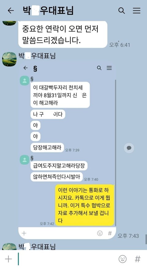 어제 제가 다니고있는 회사도 ..... 저희팀장님부터 사장님 직원들모두가 원치않는 전화나 폭언 협박, 그리고 자신의 성기사진까지도 저희팀장님 톡으로 보내면서 신@@짜르라고 하고있는 실정이고, 제입장에서도 그런팀장님이나 사장님을 봤을때 그리고 저희가족들도 아버지,어머님,동생에 이르기까지 전화기를 꺼놓고 살정도로 이사건으로 인해서 가족과도연락을 않하고 있는 상황입니다. 동생 다니는 직장에대표에게까지 연락해서 자기 성기사진보여주면서 짜르라고, 협박을 일삼았다고 하더라구요. 저희가족 백수만드는게 목표라고 하는데... 도대체!? 왜 이렇게까지 하는건지 저는 이해를 못하겠습니다.