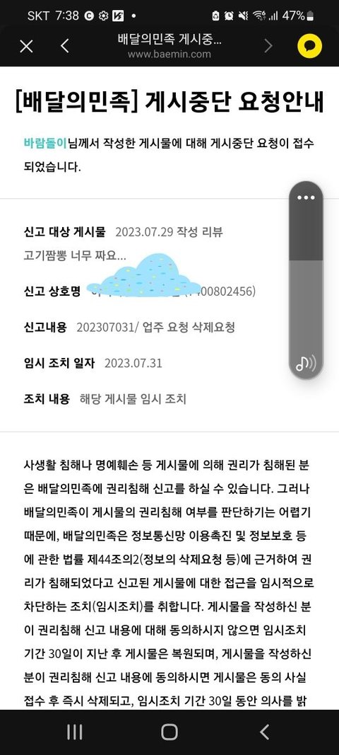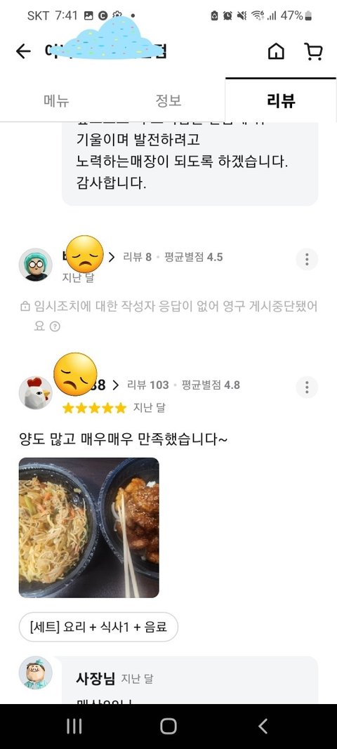 판의 글로 10년만에 처음 써보는듯해요 (예전에 한번 어떤일로 쓴적이 있었던거 같아요)눈팅은 가끔 하지만.....어쨌든 리뷰, 리플이 일상인 사람이 아니예요 그런데 한달전 중국음식을 배달했는데 너무 짰어요 입안이 얼얼할정도로 .. 탕수육도 눅눅하고 별로였지만 못먹을 맛은 아니였기에 리뷰에 사장님이 아시라고 짬뽕 너무짜요 라고 썼어요 그런데 삭제 됐더라고요 업주신고로 ...처음 알았어요 이런게 있는줄은