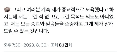 제발 우리 얘 좀 괴롭히지말고 꺼져라 저것들은 팬도 아님 니들 종교를 얘들한테 포교해서 그걸로 방탄 영향력으로 이용하려나본대 얼마나 심했으면 남준이가 라방에서 직접 언급하게 만드냐!!! 종교에 미치면 답도 없다더니 진짜 저런것들한테 선동당하지말고 팬들은 유툽이나 위버스에 저런얘들 몰려오면 같이 먹금하고 차단들 부탁해