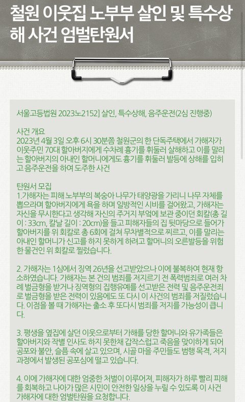 요즘 계속 발생되는 칼부림도 그렇고. 아무 죄없는 사람들을 칼로 위협하고 살인을 저지르는강력범죄는 법이 정한 최대한의 형량으로 엄벌하여 다시는 이런 일들이 일어나지 않도록사회에 귀감이 될만판 판결 결과가 나왔으면 정말 좋겠습니다. 40년 아니 50년도 억울하지만,, 선고된 26년 보다 형량이 더 늘어나길 바라며 다시 한번 도움 부탁드립니다..탄원서 동의해주셔서 그 악마같은 가해자의 형량이 최소한이나마 지켜질수 있도록 도와주십시오.